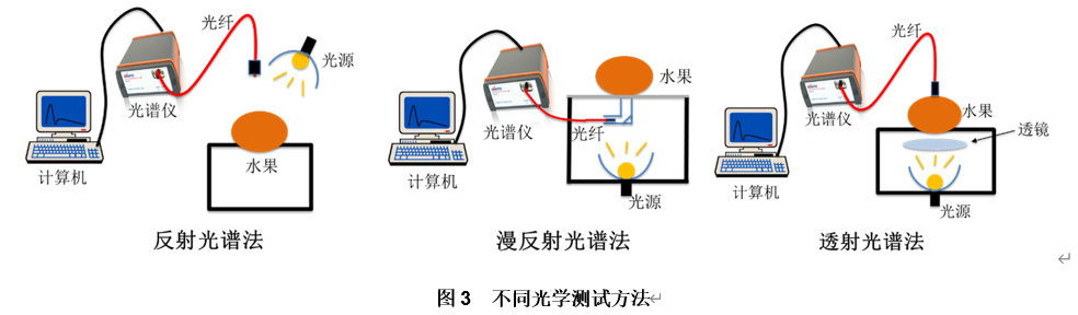 目前用于水果无损检测的主要光谱检测方法有反射光谱法、漫反射光谱法、透射光谱法,其光路分别如下图所示。在这些光路中,光源可采用单个或多个50 W卤素灯组合的方式,既可以提高光照功率,也可以提高光照均匀度。光谱仪可以采用Avantes生产的光纤光谱仪,其体积小,方便集成到系统中,波长范围最多可以覆盖200-2500 nm,最短积分时间可以达到2 μs,满足对全部物料快速、高效的测试需求。光纤可采用Avantes 800 μm或者1000 μm的大芯径,提高光通量,金属铠甲包层可保护光纤避免损伤。此外,Avantes也可提供多种附件选择,满足不同的应用场景。