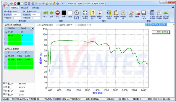 1. 热反射涂料太阳反射比测量专用光谱分析软件,软件具有计算建筑太阳反射比、反射颜色、建筑节能效果和出具测试报告的功能,可以智能提示测试天气和采样个数,可实时查看原始数据点和96个标准数据点,独有管理员功能可确保数据安全