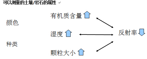 有机质含量增大、湿度增大、颗粒变大往往会导致反射率的下降。测量有机质含量,湿度和颗粒大小往往需要在其他条件恒定的状态下才可以比较。