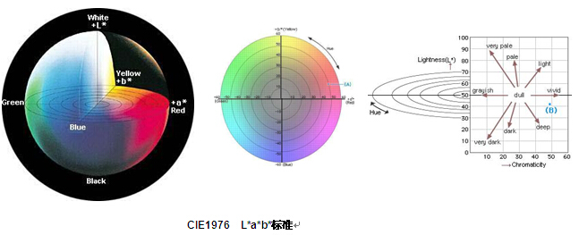 物体的颜色可以用CIE1976(L*a*b*)颜色空间表示。L*值表示颜色的亮度,正的a*值表示颜色的红色值,负的a*值表示颜色的绿色值。近似地,黄色和蓝色值由b坐标值表示,正值表示颜色的黄色值,负值表示颜色的蓝色值。L*a*b*各值可以根据样品(物体)的CIE三刺激值X,Y,Z和标准光源的三刺激值Xn,Yn,Zn得到,标准光源的三刺激值Xn,Yn,Zn为常量,仅取决于所选择的标准光源的类型。